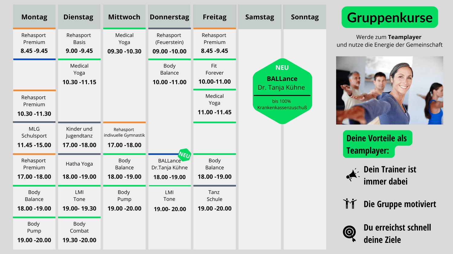 Unsere Gesundheitskurse wie Medical Yoga, Rehasport und Präventionsangebote helfen dir dabei, Beschwerden gezielt zu lindern, deinen Körper nachhaltig zu stärken und neue Bewegungsfreude zu entdecken.